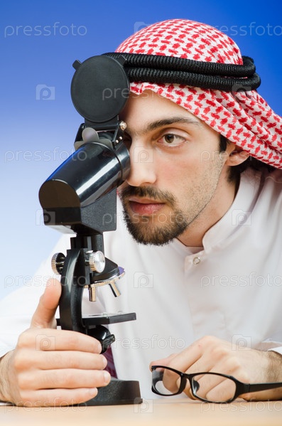 Мужчина в арабском платке смотрт в микроскоп