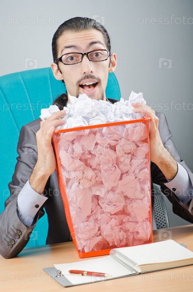 Бизнесмен сидит за столом и держит мусорную корзину с макулатурой