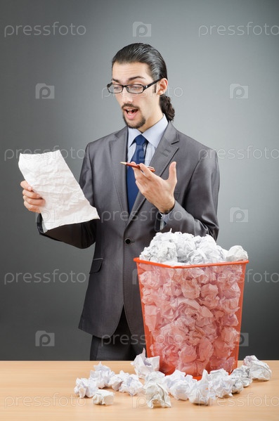 Бизнесмен с макулатурой на сером фоне