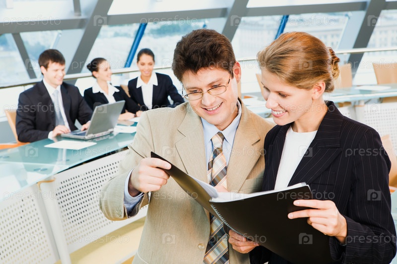 Бизнесмены держат блокнот и читают текст