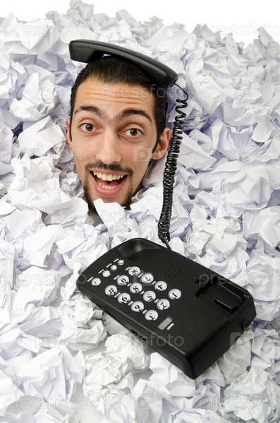 Мужчина с телефоном среди макулатуры