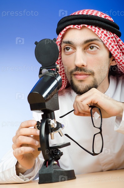 Мужчина в арабском платке смотрит в микроскоп