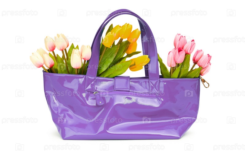 Сумка и цветы, изолировано на белом фоне