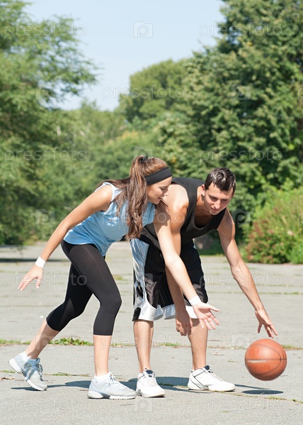 Молодые мужчина и женщина играют в баскетбол на открытом воздухе