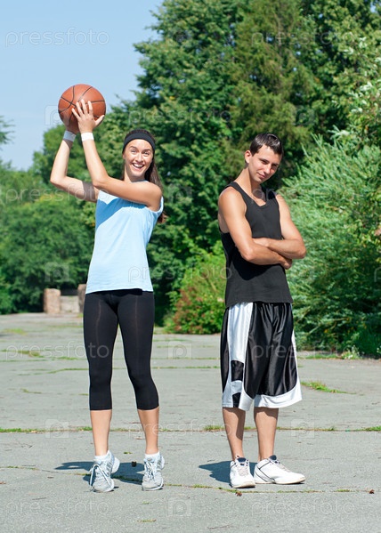 Молодые мужчина и женщина играют в баскетбол на открытом воздухе