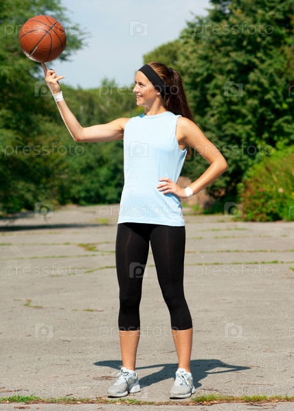 Молодая баскетболистка крутит мяч на пальце