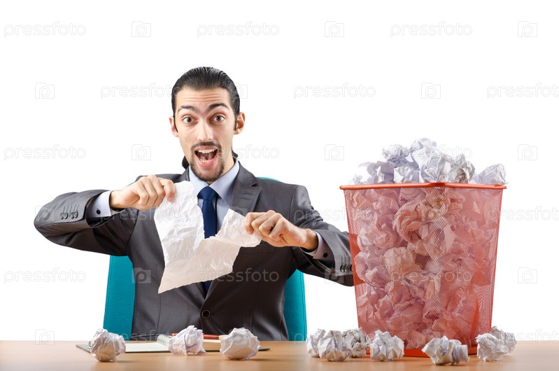 Человек с большим количеством мятой бумаги