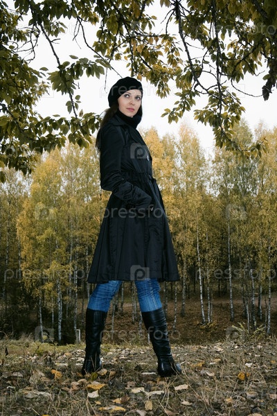 Строгая красивая женщина в очках стоит в осеннем парке