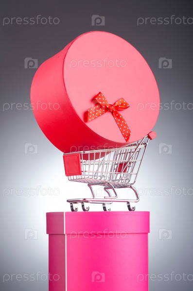Подарочные коробки и продуктовая тележка на сером фоне