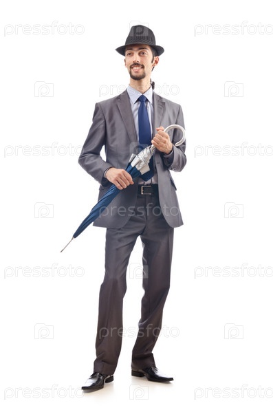 Бизнесмен с зонтом на белом фоне