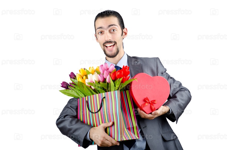 Предприниматель с подарком и тюльпанами в руках