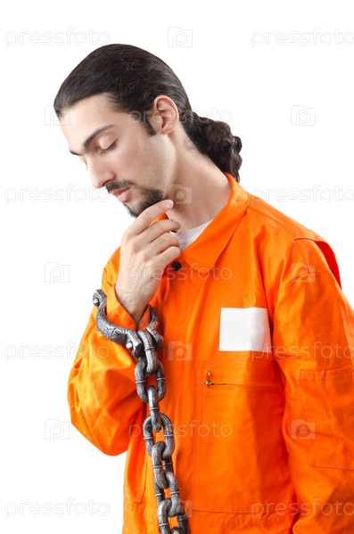 Заключенный мужчина в оранжевой одежде с кандалами на белом фоне