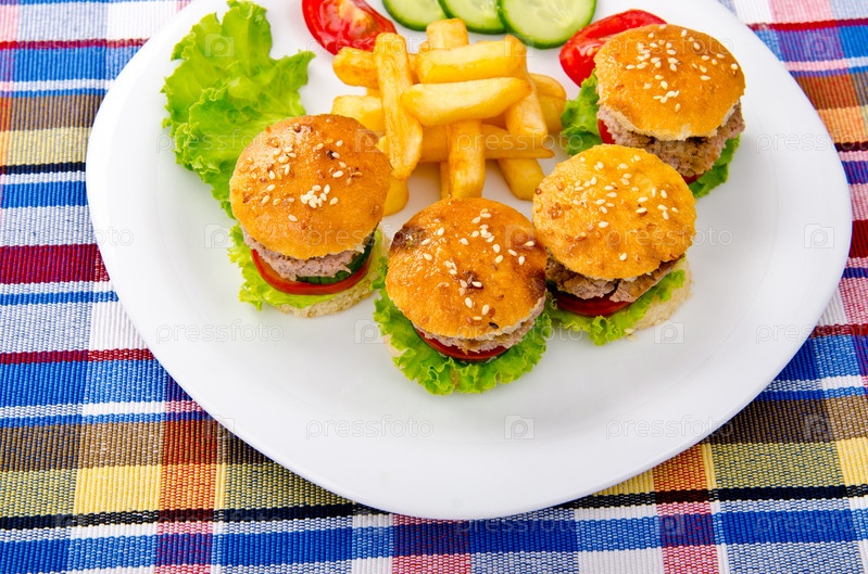 Гамбургеры и картошка фри на тарелке