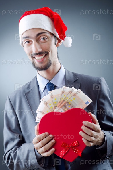 Молодой человек в шапке Санты-Клауса с евро