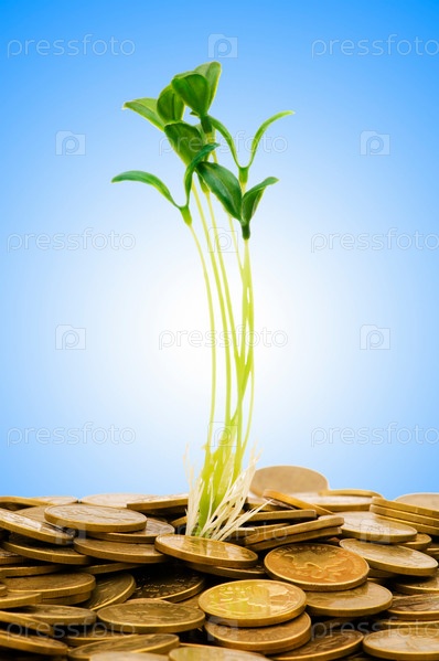 Зеленый саженец растет из денежных монет на голубом фоне