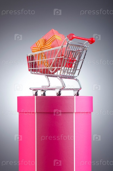 Покупательская тележка с подарком на розовой коробке на сером фоне