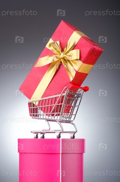 Покупательская тележка с подарком на розовой коробке на сером фоне