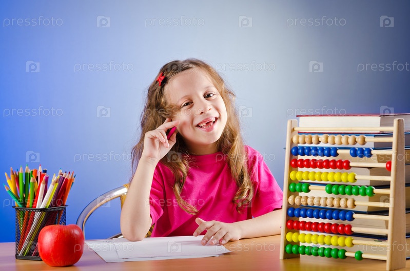 Маленькая девочка сидит за столом с цветными карандашами, счетами и бумагой
