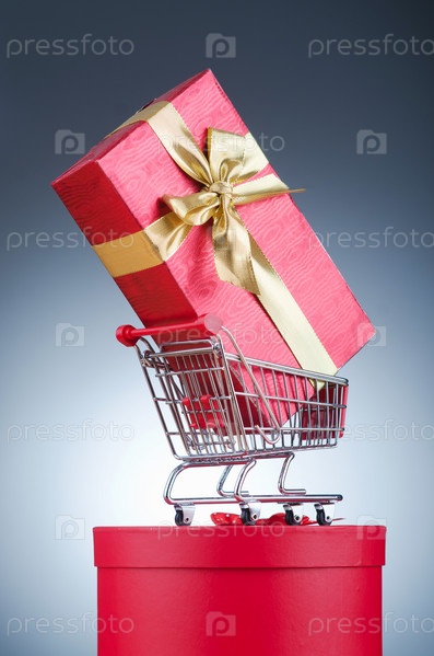 Покупательская тележка с подарком на розовой коробке на сером фоне