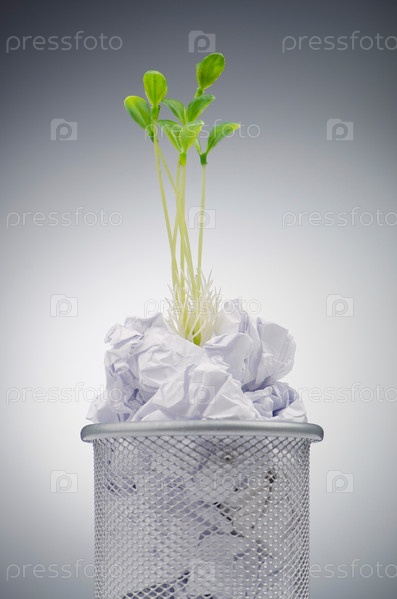 Зеленый саженец в корзине с макулатурой на сером фоне