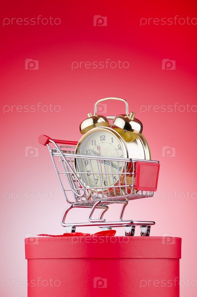Покупательская тележка с будильником на красной коробке на красном фоне