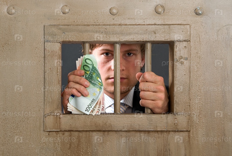 Преступник за решеткой с деньгами. Концепция мошенничества