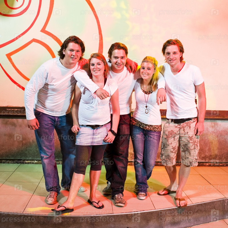Группа из пяти молодых людей на танцполе в ночном клубе