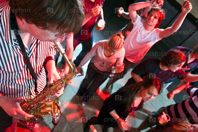 Саксофонист и танцующие люди в ночном клубе