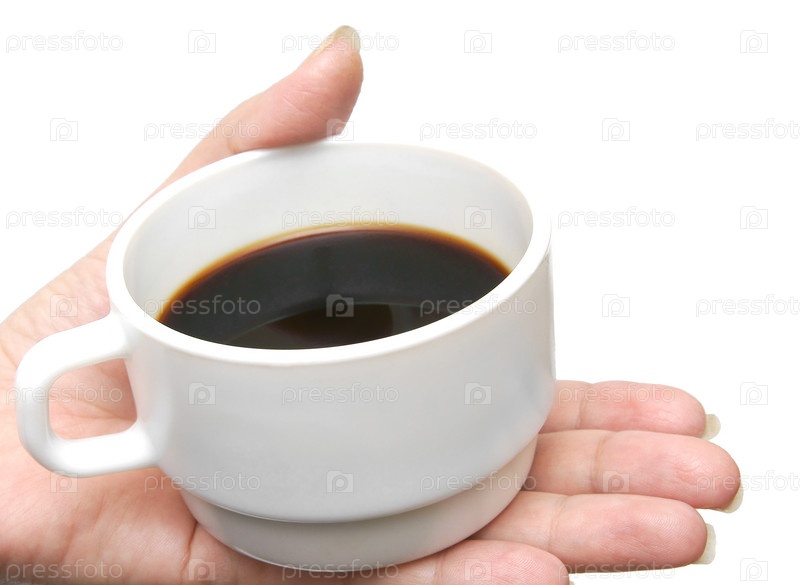 Чашка кофе в женской руке, изолировано на белом фоне
