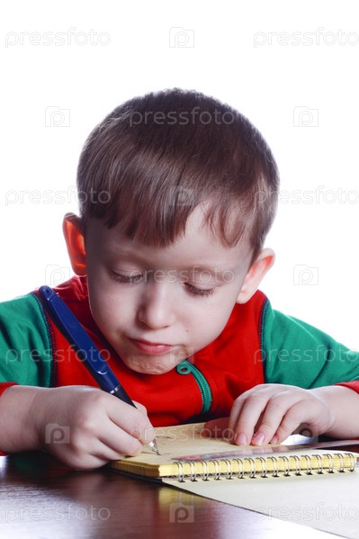 Мальчик делает домашнее задание. Изолирован на белом фоне