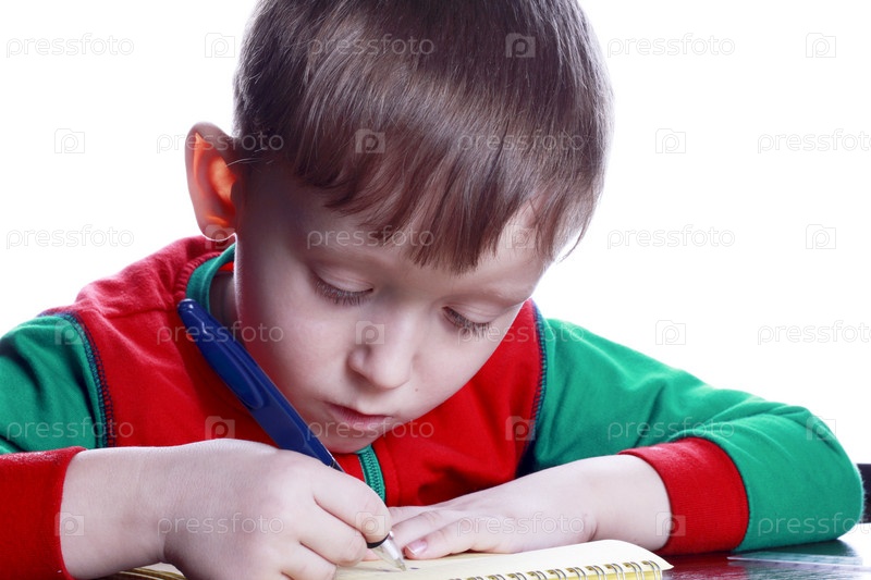 Мальчик делает домашнее задание. Изолирован на белом фоне