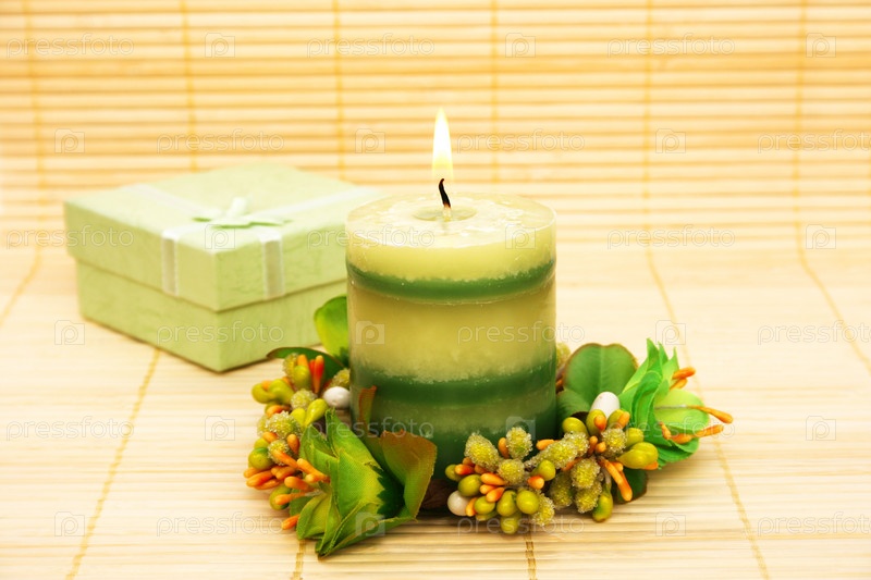 Свеча с цветами и коробочка на бамбуковой циновке