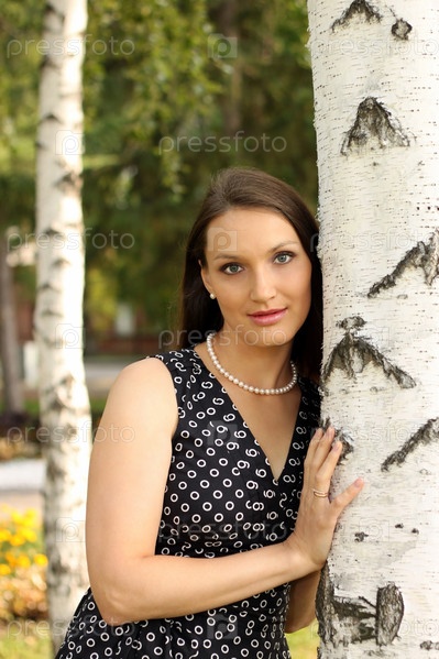 Красивая девушка в черном платье стоит у березы