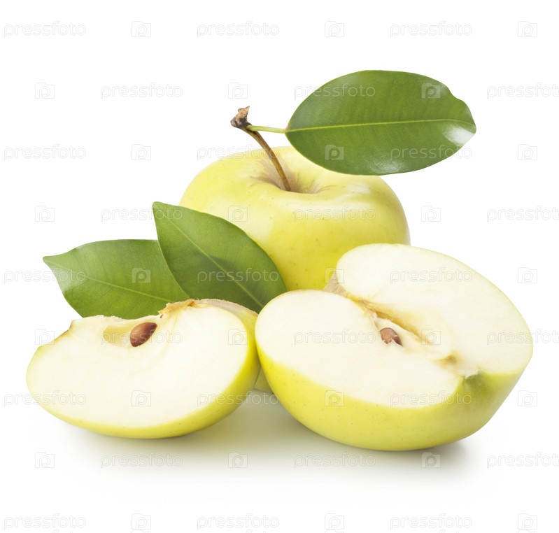 Целое яблоко и дольки яблока на белом фоне