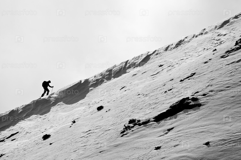 Лыжник взбирается на гору