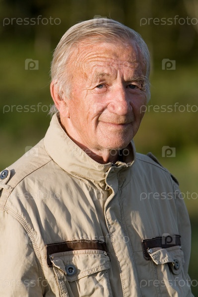Портрет седой пожилой мужчины в бежевом куртке в деревне на природе
