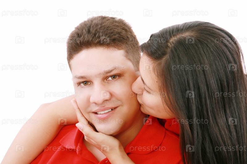 Молодая женщина целует своего друга