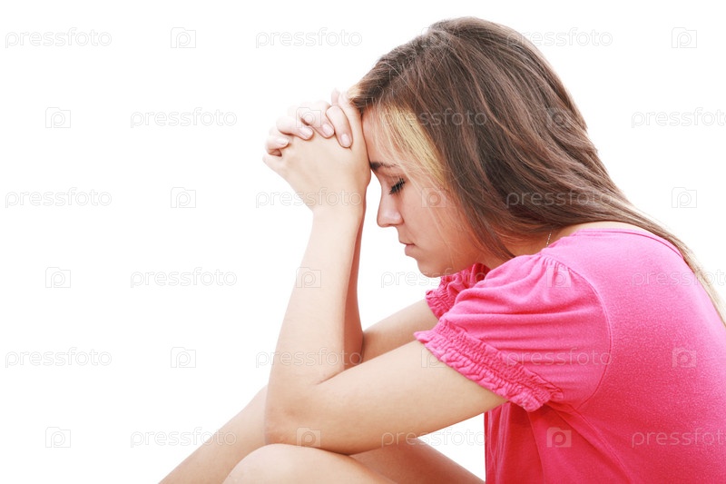 Девушка молится на белом фоне