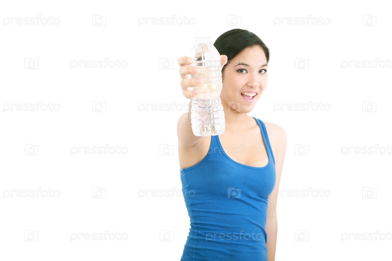 Девушка держит бутылку с водой на белом фоне
