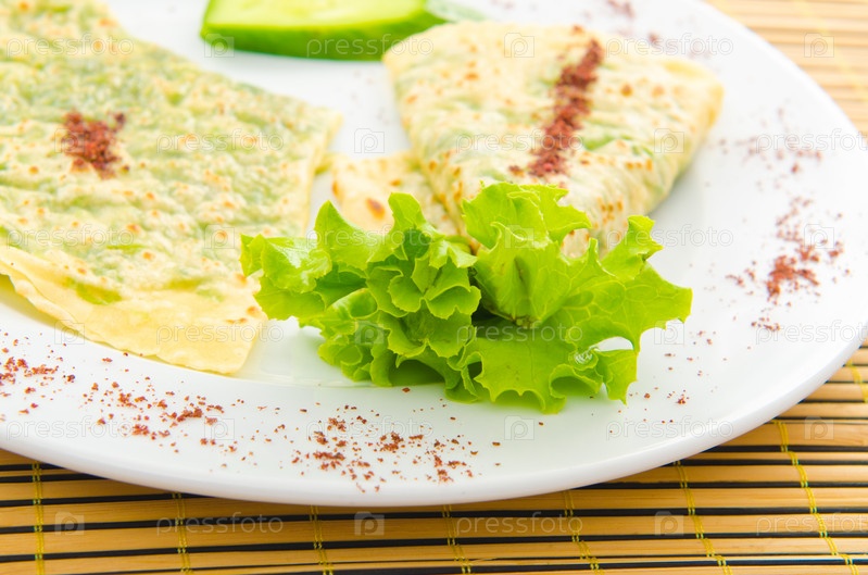 Блины с листьями салата на тарелке