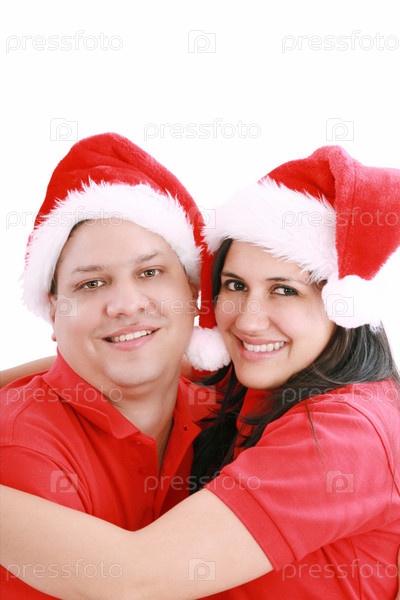 Молодая пара в шапках Санта Клауса на белом фоне