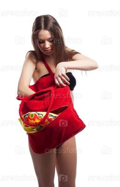 Девушка в черном бикини ищет что-то в сумке