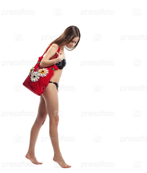 Девушка с красной сумкой на белом фоне