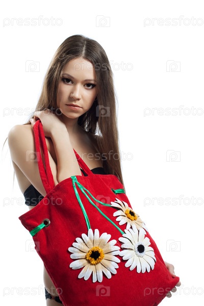 Девушка с красной сумкой на белом фоне