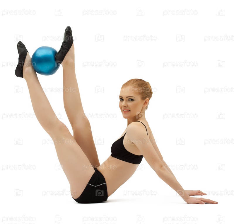 Девушка-гимнастка с мячом на белом фоне