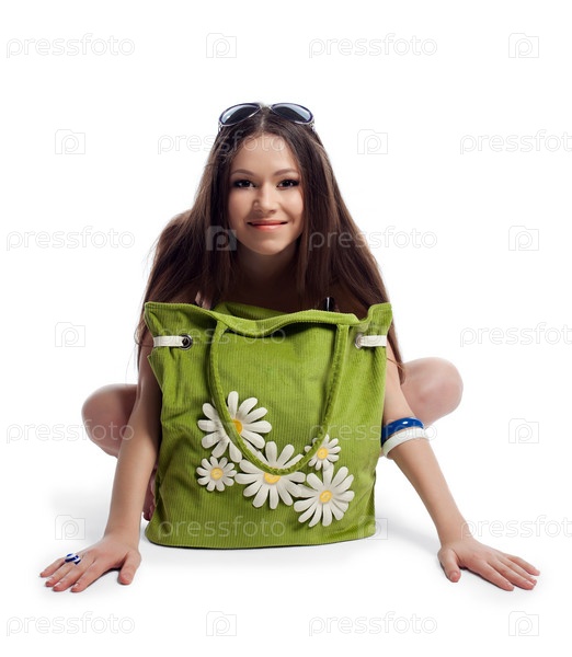 Девушка с зеленой сумкой на белом фоне