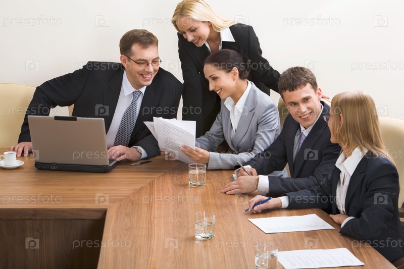 Портрет улыбающихся бизнесменов, обсуждающих различные вопросы, сидящих за столом с открытым ноутбуком, документами и очками на нем