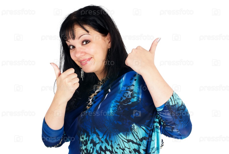 Молодая красивая женщина с поднятыми вверх пальцами