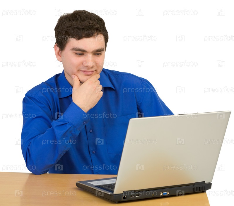 Молодой человек сидит за столом с ноутбуком