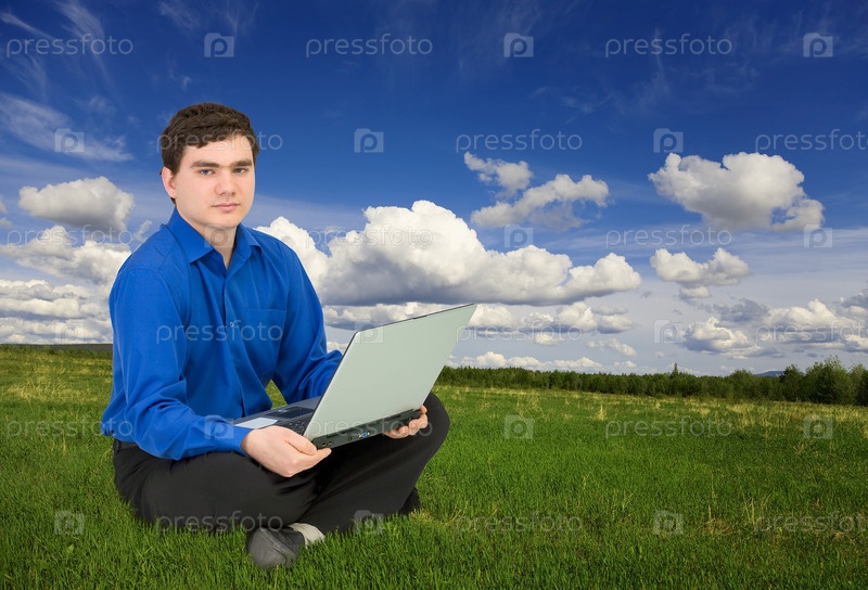 Молодой бизнесмен сидит на работе с ноутбуком в зеленом поле